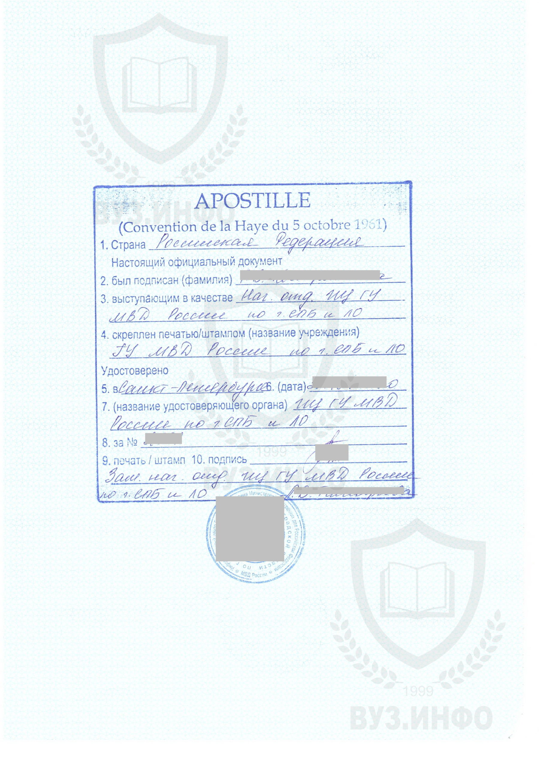 Апостиль на справку о несудимости от Информационного центра ГУ МВД по г. Санкт-Петербургу и Ленинградской области