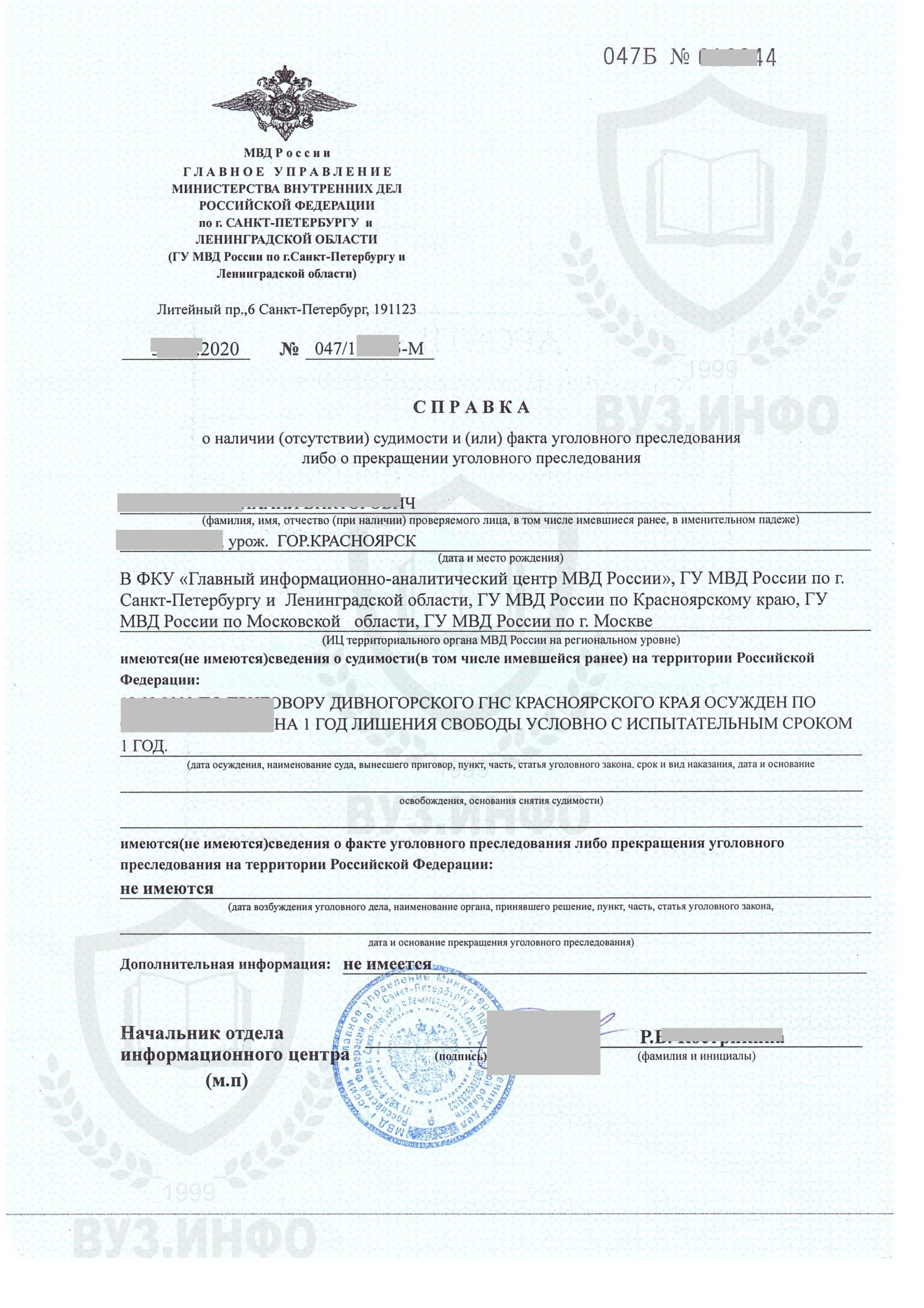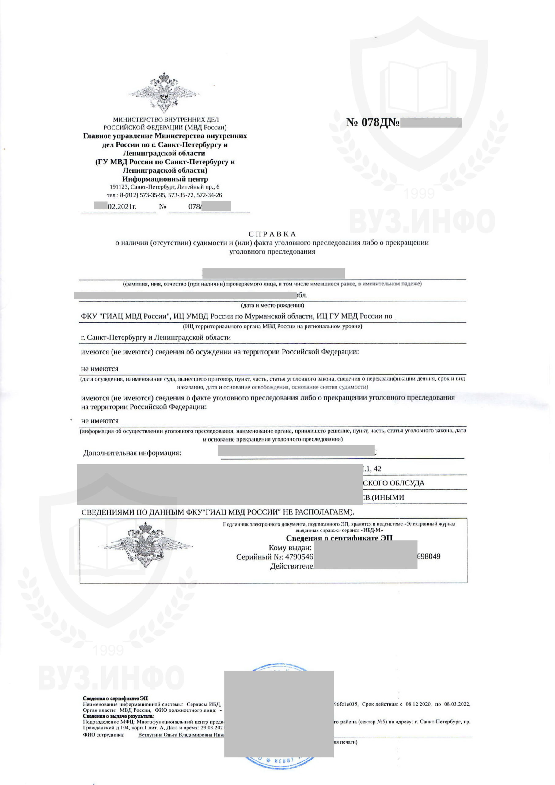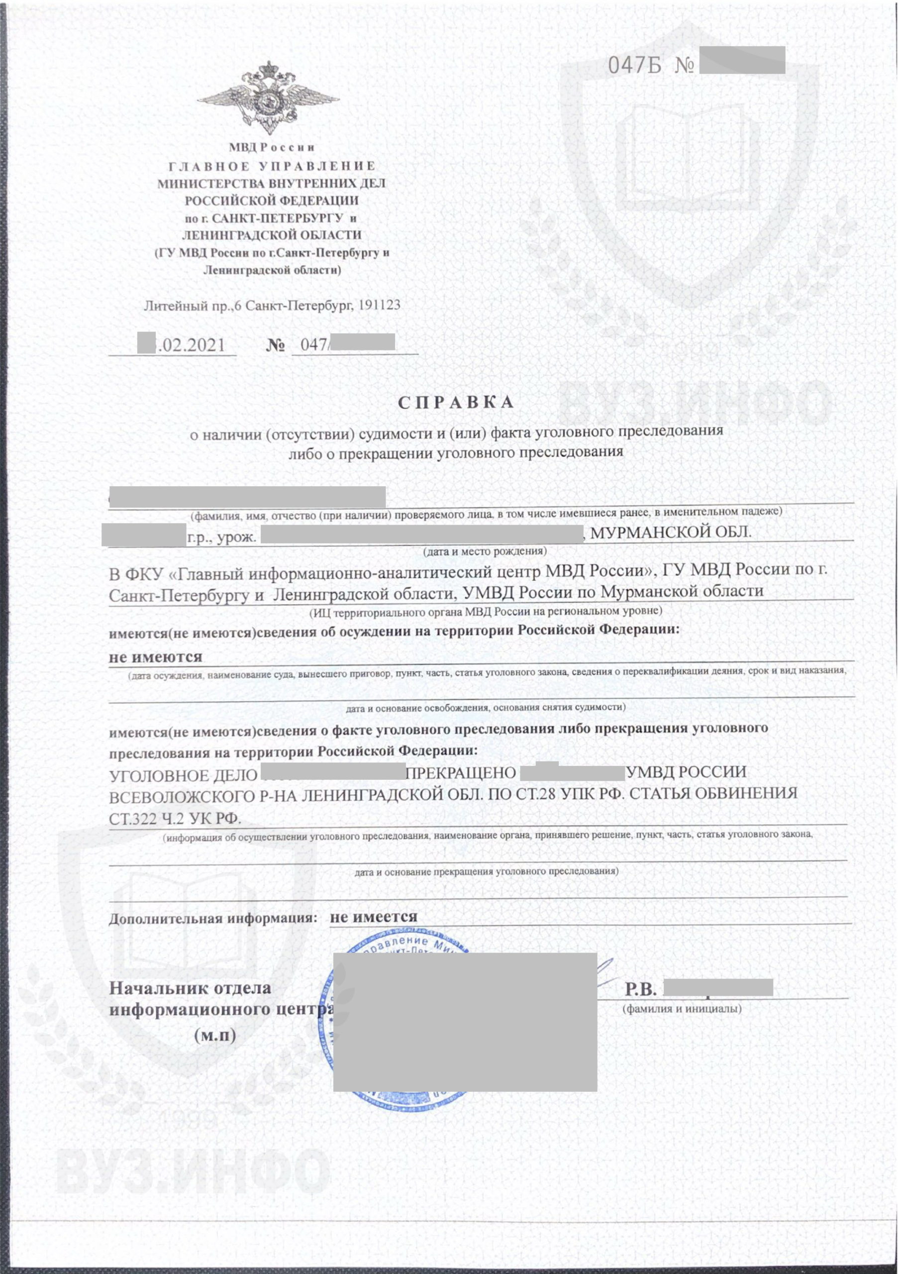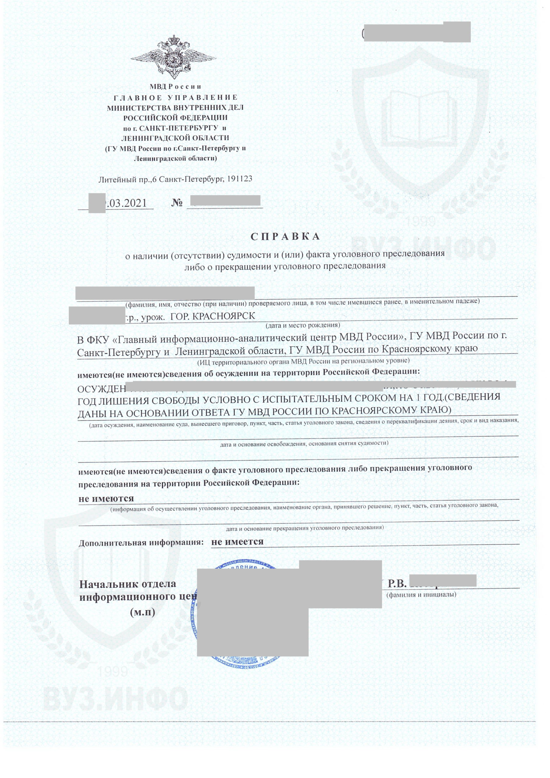 Конечно же много справок приходится делать из второго по населению города России — Санкт-Петербурга. В Северной столице проще купить справку о несудимости на ВУЗ.ИНФО — это быстро и с известным заранее результом.