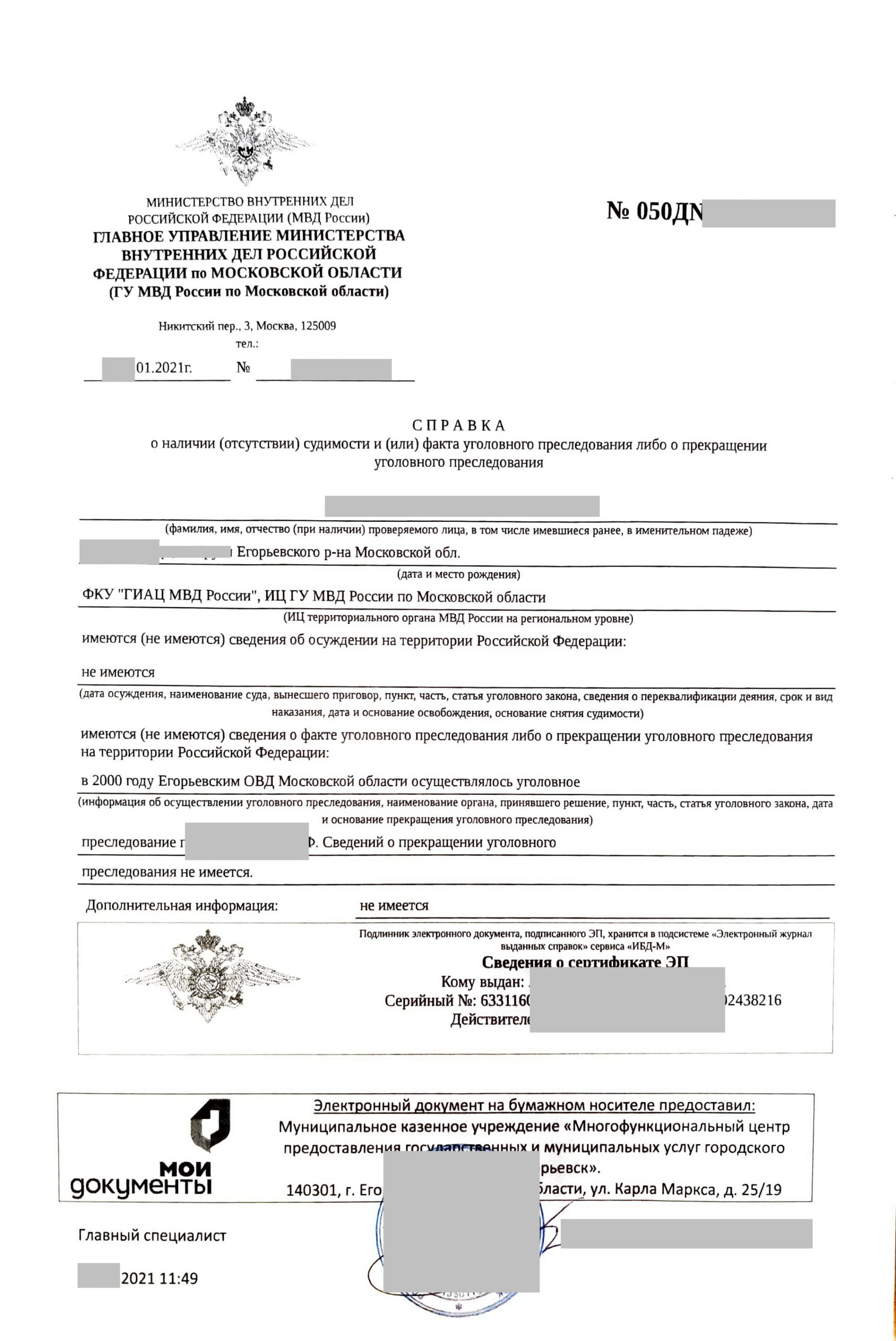 Справка об отсутствии судимости из МФЦ г. Москвы