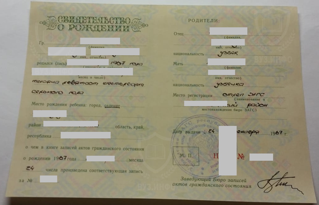 Тут всё просто — если вам нужен качественный документ, а не липа слепленная на коленке, то надо обращаться в сёрьезную компанию, которая имеет имя и занимается такими документами очень давно. ВУЗ.ИНФО именно такая организация. У нас есть брендовое имя с большим количеством реальных отзывов и огромный опыт в изготовлении свидетельств ЗАГС.